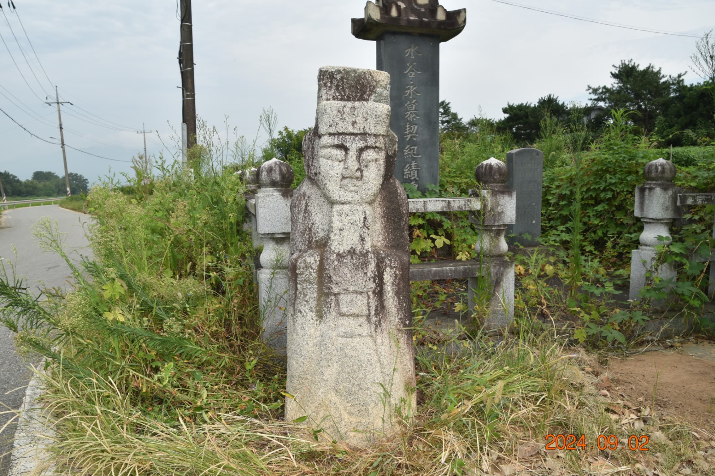석장승의 위치는 북구 장등동 171-1번지 수곡마을 버스정류장에 해당 된다. 이 석장승은 수곡마을 맞은편 용강마을로 들어가는 버스정류장 길목에 2기가 동서 2m 간격으로 나란히 위치해있는데 서쪽의 담양 대전면 대치를 등지고 수곡마을 안쪽을 향해 서 있다. 대체적으로 이러한 종류의 석장승들은 사대부 가문의 묘소에서 쉽게 찾아볼 수 있으나 수곡마을의 석장승은 그 출처가 어디인지는 자세하지 않다. 좌측에 위치한 석인상은 입술은 꼭 다물고 근엄한 모습을 취하고 있으며 머리에는 사모관대를 쓴 고위직 문관으로 보인다. 또한 두 손을 공손하게 모아 마치 중읍례 자세를 하고 홀대를 턱높이까지 들고 있으며 얼굴과 몸이 균형을 이루는 전형적인 문인석으로 보인다. 우측에 위치한 석장승은 얼굴에 비해 눈이 약간 크고 코와 입은 잘 조화롭게 조각되어 있다. 이 석장승 역시 문인석으로 홀을 휴대하고 있는 것은 공통적이나 우측 장승과 달리 조선시대 중인들이 썼던 탕건과 유사한 모자를 쓰고 있어 좌측 장승보다 신분이 약간 낮은 석장승으로 표현하고 있다. 풍수적으로는 이러한 문인석이 외부로부터 오는 재액災厄이나 사귀邪鬼를 막는 의미보다는 안에서 밖으로 빠져나가려는 이 마을의 기운을 담아 둔다는 의미를 강조하는 뜻에서 이런 배치를 했을 가능성이 높다. 따라서 이들 석상들은 액막이보다는 수구막이의 의미가 더욱 중시된 것으로 이해할 수 있으며, 이것은 '금반옥호金盤玉壺, 옥녀가 소반을 앞에 두고 있는 형상'의 명당을 이루는 기운들이 외부로 유출되는 것을 막는다는 의미를 가졌다고 볼 수 있다. 문인석 뒤편에 '수곡영모계기적비'가 함께 있어 북구지역 뿐만 아니라 광주광역시 전체에서 위친계기적비가 있는 곳은 이곳과 용전동을 제외하고는 그 사례가 드물고 석장승 역시 도로변에 일괄로 있어 지역 문화유산으로 보존할 가치가 높다고 하겠다.